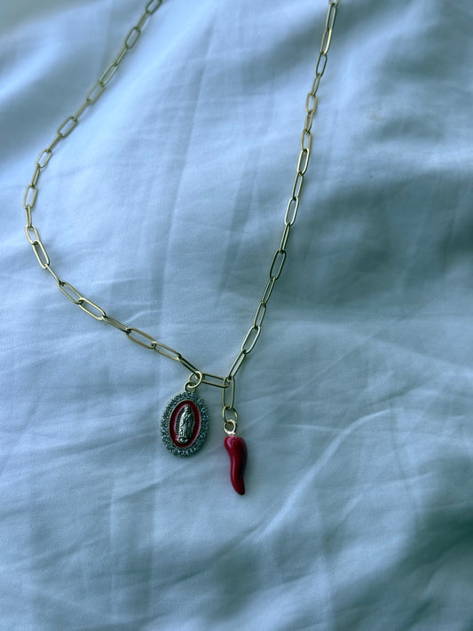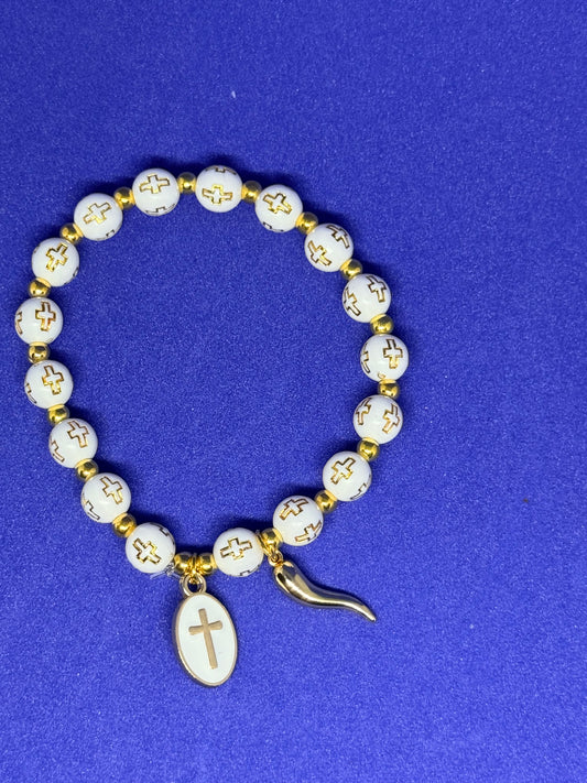 Blue white ceramic bracelet with Italian horn blessed mother and cross