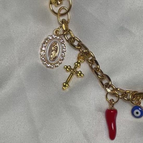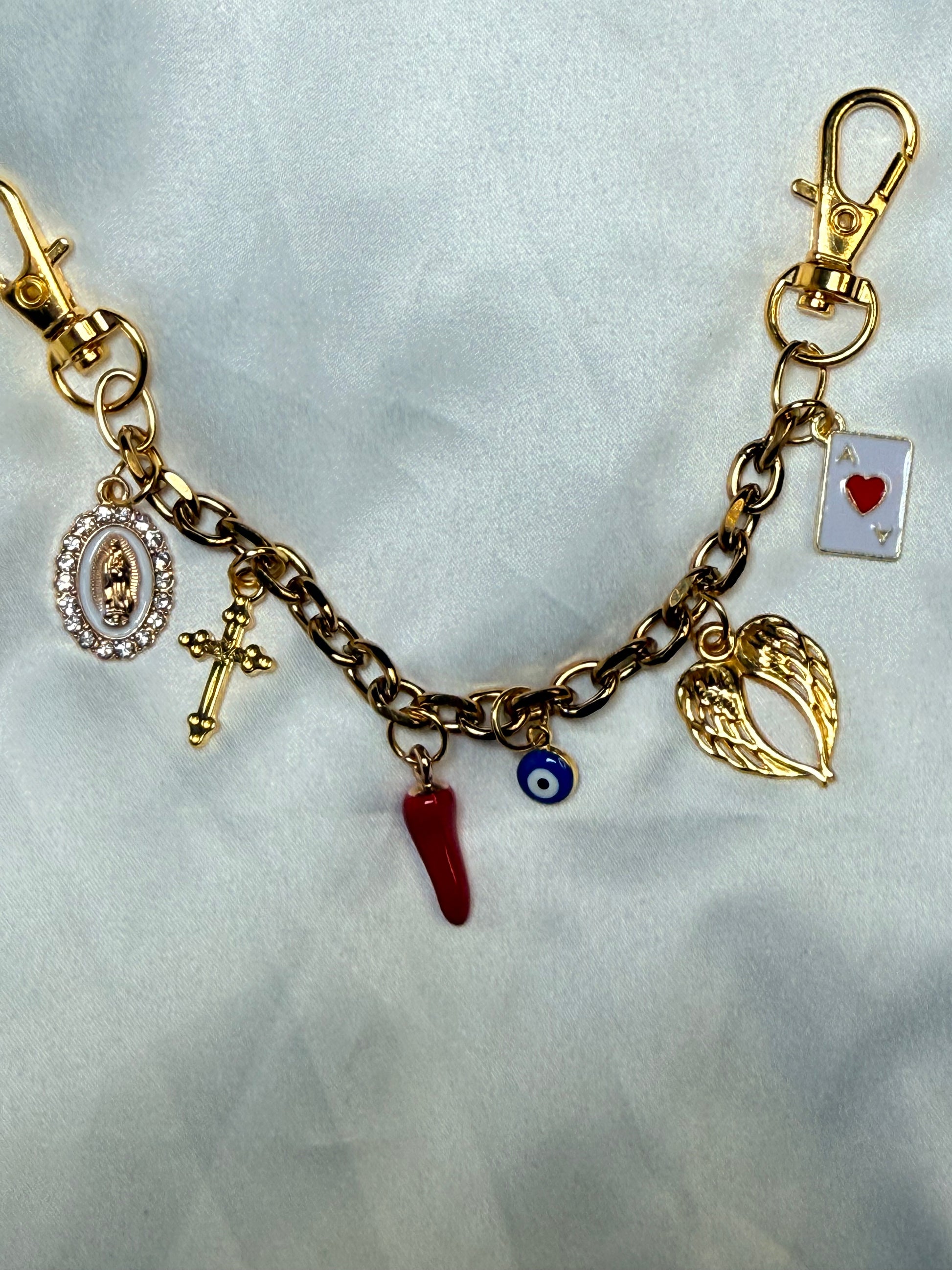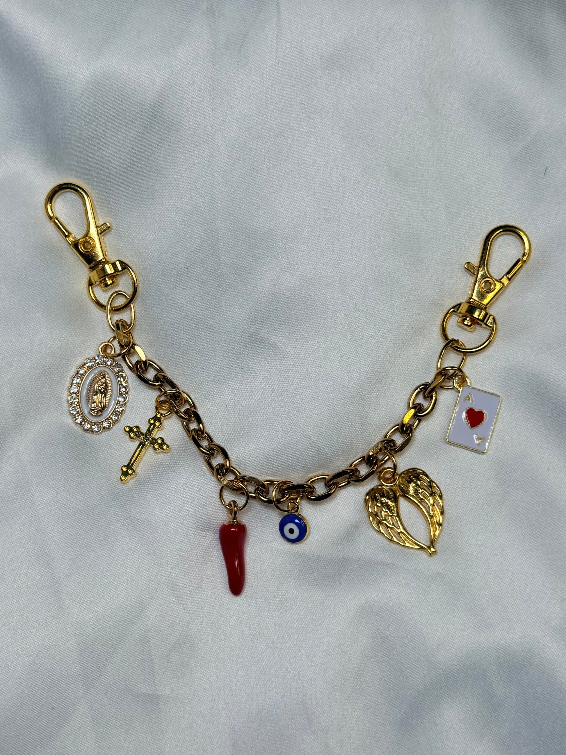 Stay protected with this bag chainThe 6 charm bag chain combines protective symbols including a blessed mother, evil eye, angel wings, Italian horn, ace card, and cross. Each charm is designed to offer spiritual protection and enhance personal style, making it a practical accessory for both safety and aesthetics.