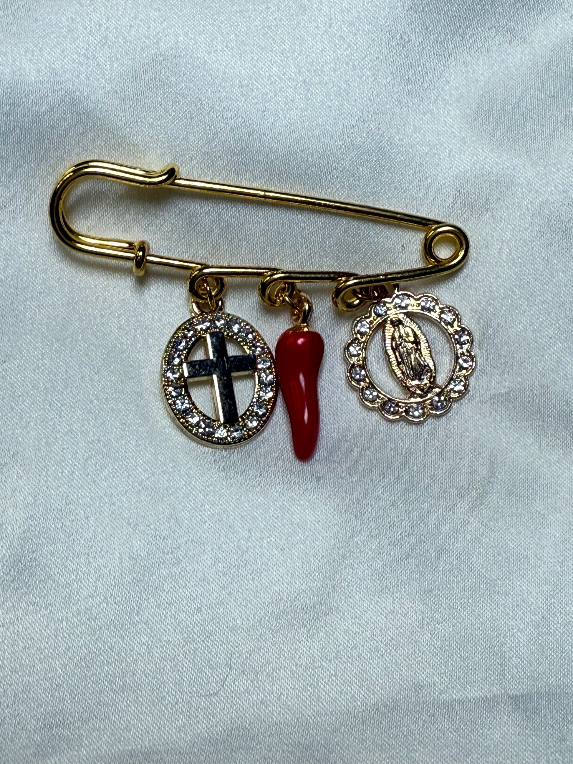 As a symbol of divine protection and blessings, our God bless her round charm is a must-have for anyone seeking spiritual guidance. Featuring the blessed mother and a red Italian horn, this pin is a staple in any collection. Give the gift of protection and blessings to a loved one with our God bless her round charm.