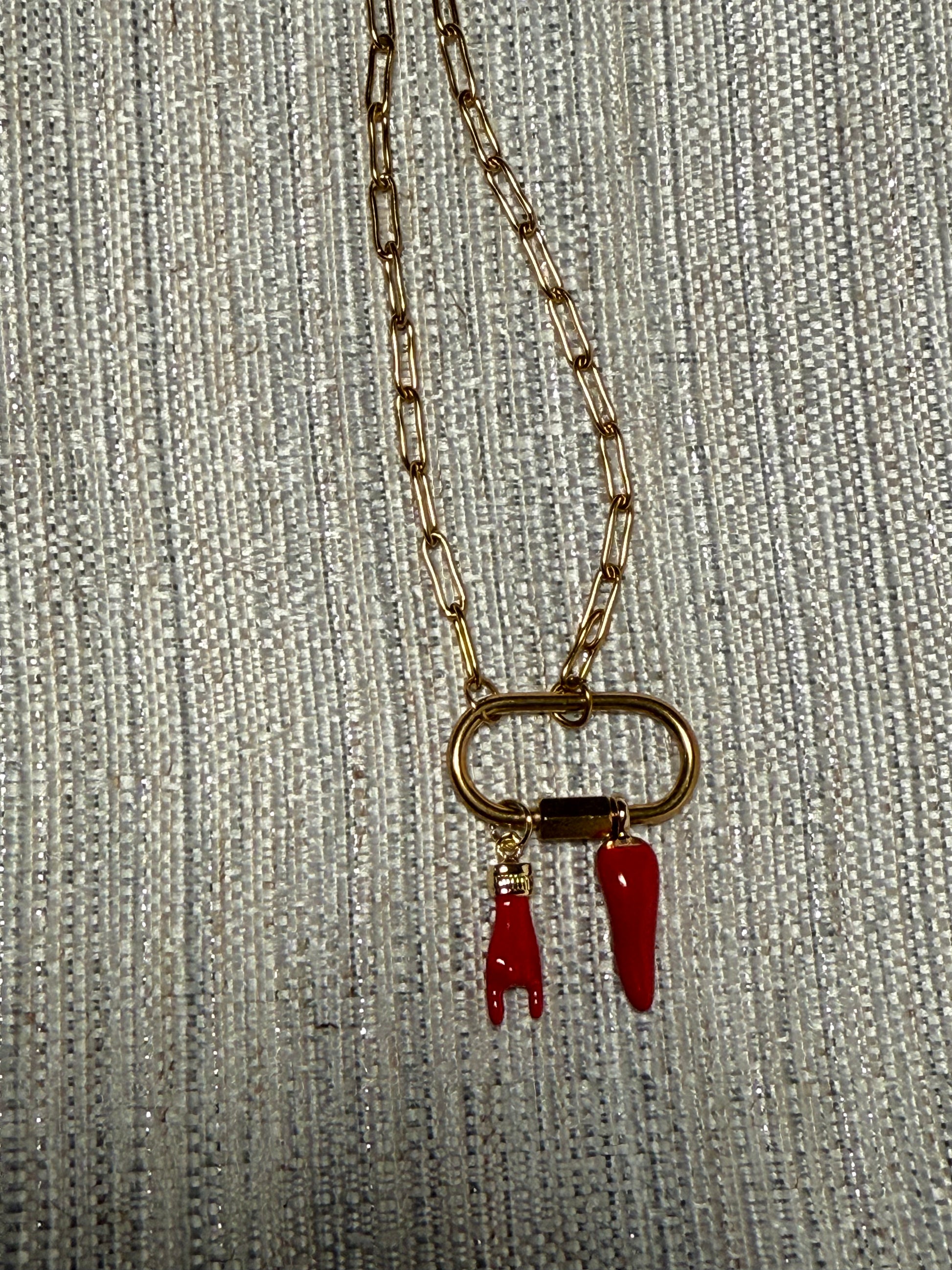 Introducing The Desi, the must-have accessory worn by our beloved Desi, the Cafecito mommy on TikTok. This gold-colored safety pen clip necklace features Italian hands and an Italian horn, providing both style and protection. Stay trendy and safe with The Desi.
