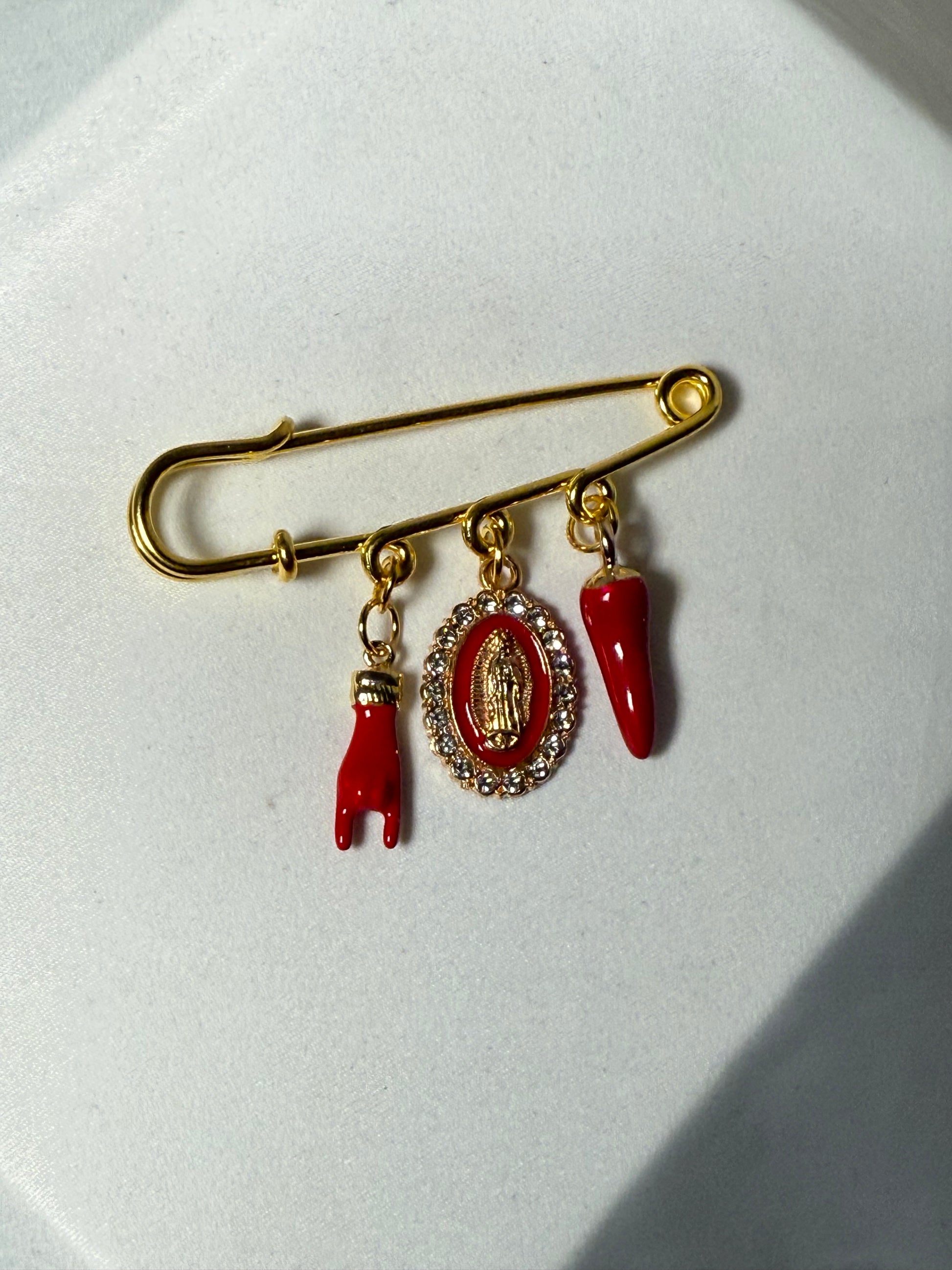 Experience ultimate protection with our red pin featuring timeless Italian horn, blessed mother, and Italian hand designs. No need to look further, this pin provides unbeatable protection and guards against any danger. Feel secure with our ultimate protection red pin.